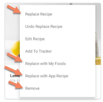 - Replace Recipe – The app will replace the recipe with another that fits your macros (for that slot)