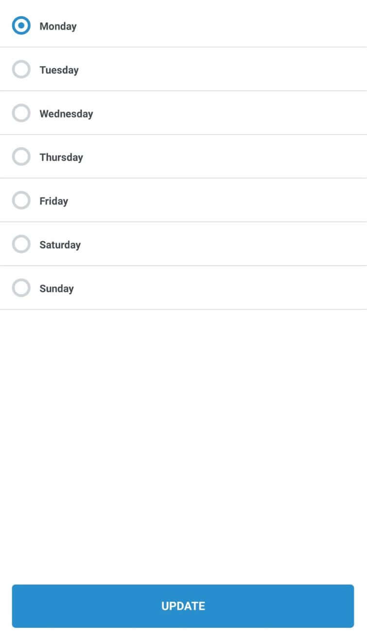 - Select your preferred day of the week for your meal plans to start and hit Update: