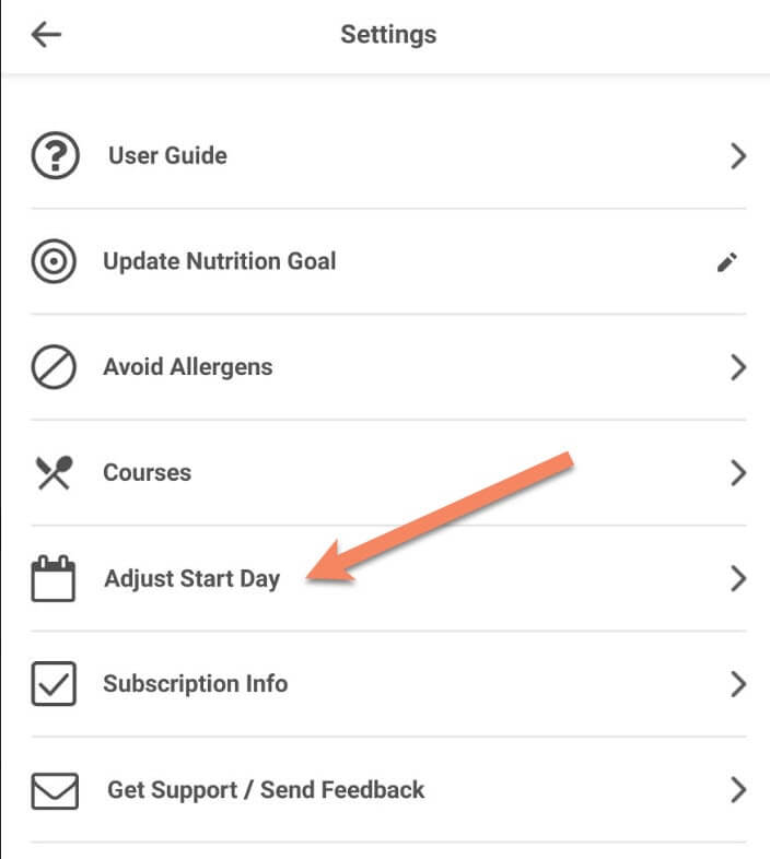 You can change the starting day of your meal plans to any day of the week based on your preference. This way you can have your preferred weekly cycle (i.e. Sunday through Saturday or Monday through Sunday).