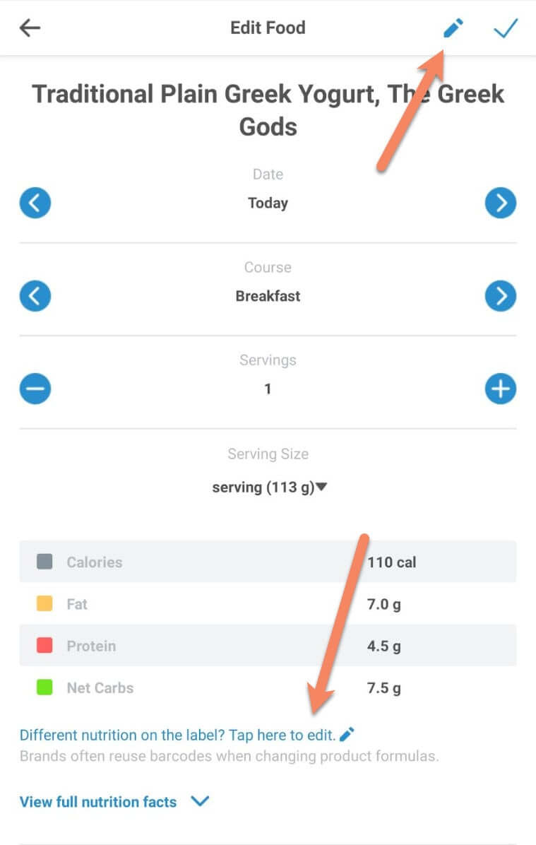 - Tap the pencil icon in the top right corner or “Different nutrition on the label?” text to edit it.