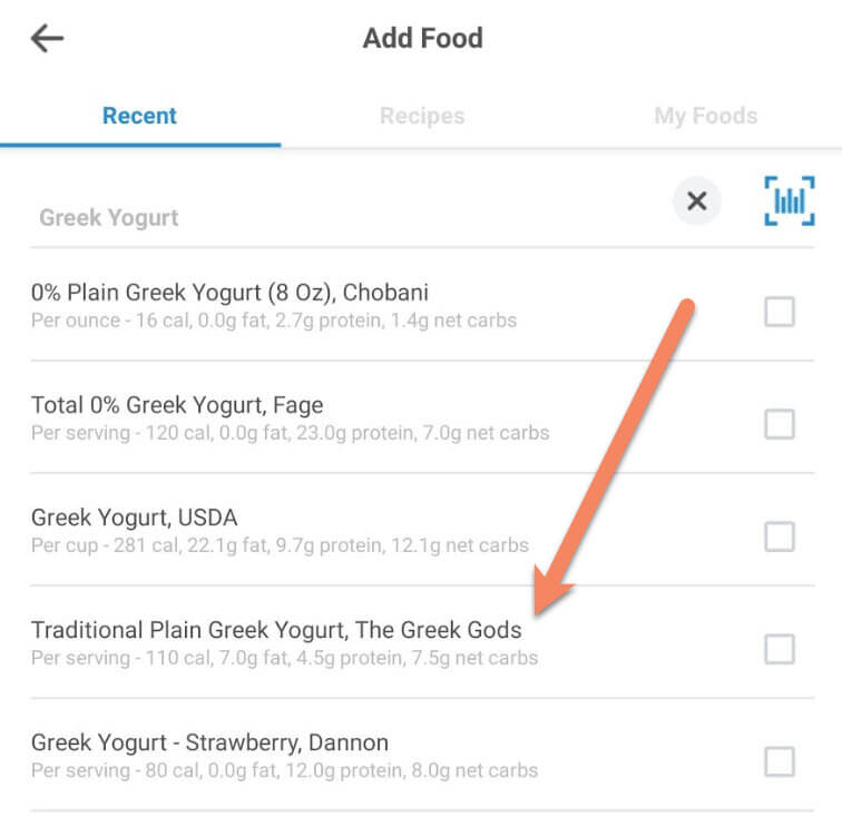- Search for a food or scan a barcode and tap it to open the Edit screen: