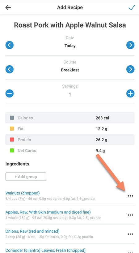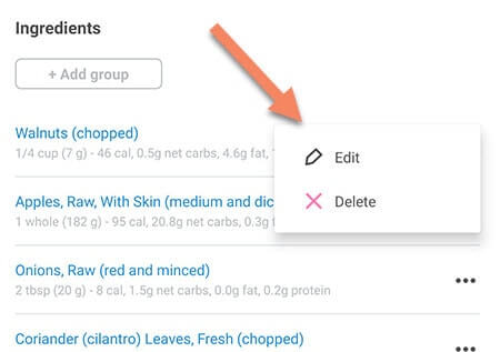 - To edit or remove an ingredient, tap the 3 dots to the right of the ingredient(s) you want to edit or remove (you can also tap any part of the ingredient name to edit it)