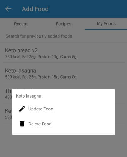 Press and hold the custom food and a popup with the option to update or delete your custom food will appear: