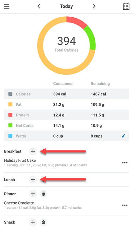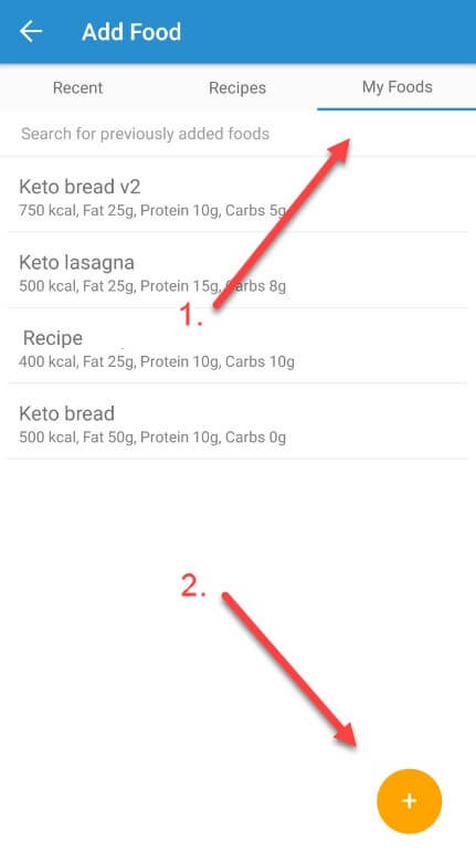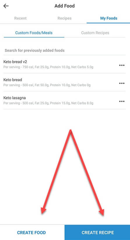- Switch to the My Foods tab and press the Create Food or Create Recipe button: