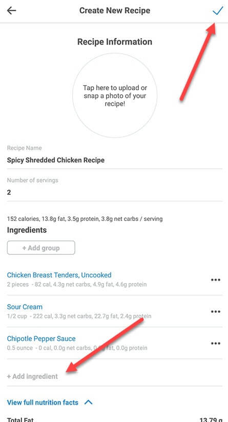 - Fill in the fields and tap the checkmark to finalize your new custom food or recipe:
