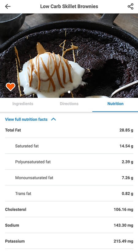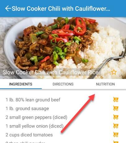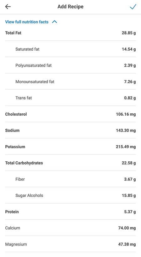 4. You can also view the full nutrition data when adding the recipe as a food entry by scrolling down past the ingredients list: