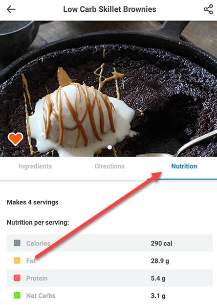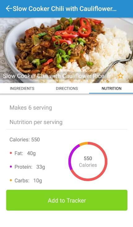 3. Here you'll see the number of servings the recipe makes and the calories and macronutrients per serving. You can also add the recipe to your tracker!