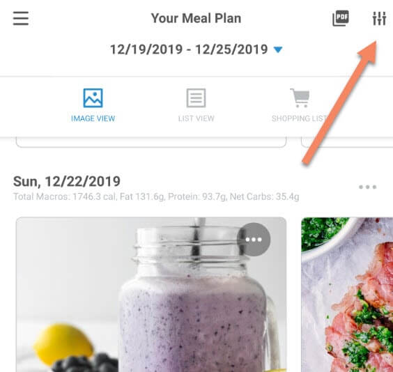 - Tap the Settings icon in the top right corner of the Meal Plan screen: