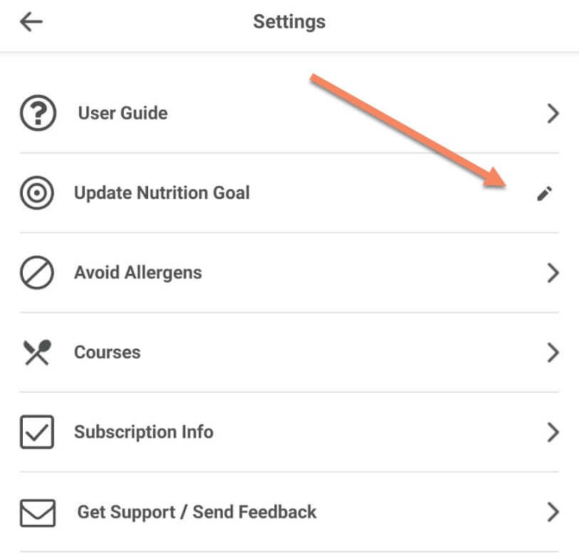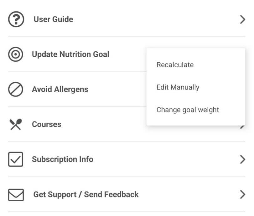 - Change goal weight: Allows you to update your goal weight which controls the deficit or surplus of the meal plan